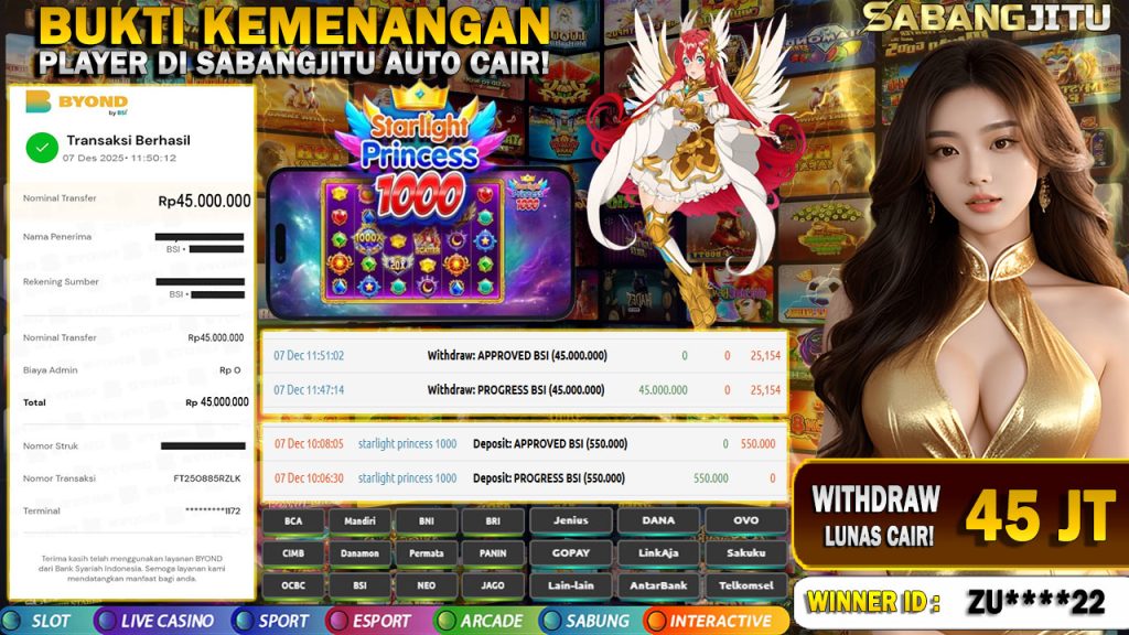 BUKTI KEMENANGAN 07 DESEMBER DI GAME starlight princess 1000 WITHDRAW 45.000.000.,-
