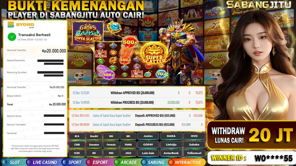 Bandar togel SABANGJITU merupakan bandar togel dan slot online yang membayar semua kemenangan member hingga lunas. Setiap pembayaran pada situs kami dilakukan dengan cara transfer ke rekening tujuan yang sudah di daftarkan pada situs togel online kami, Pembayaran hanya dapat di proses jika rekening yang di daftarkan telah valid dan dapat di transfer. Semua kemenangan member yang mendapatkan hadiah jackpot terbesar akan kami posting agar semua pemain dapat melihat bandar situs terpercaya SABANGJITU ini membayar semua kemenangan member hingga lunas. Setiap postingan yang kami posting akan kami lakukan sensor pada nomor rekening 4 digit dan nama rekening untuk menjaga privasi dan kerahasiaan member. Postingan Jackpot yang kami posting agar member atau pemain yang belum pernah bermain bisa melihat bandar togel Bukan Kaleng Kaleng Seperti SABANGJITU ini, Semua postingan jackpot yang kami posting dapat di lihat data keasliannya melalui nomor reff yang di tunjukan pada bank atau mbanking saat kita melakukan transfer.