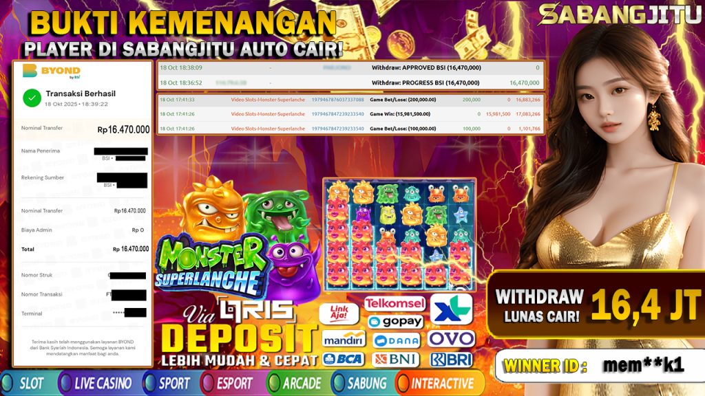 BUKTI KEMENANGAN 18 OKTOBER DI GAME MONSTER SUPERLANCHE-PRAGMATIC PLAY WITHDRAW 16.470.000.,-