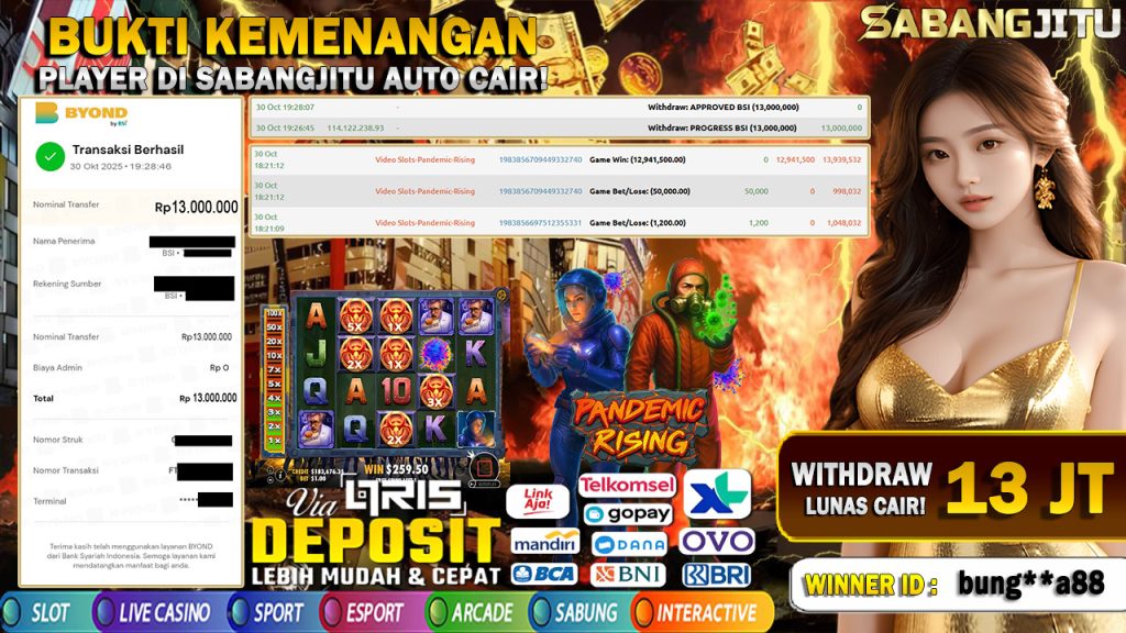 BUKTI KEMENANGAN 30 OKTOBER DI GAME Pandemic Rising – Pragmatic Play WITHDRAW 13.000.000.,-
